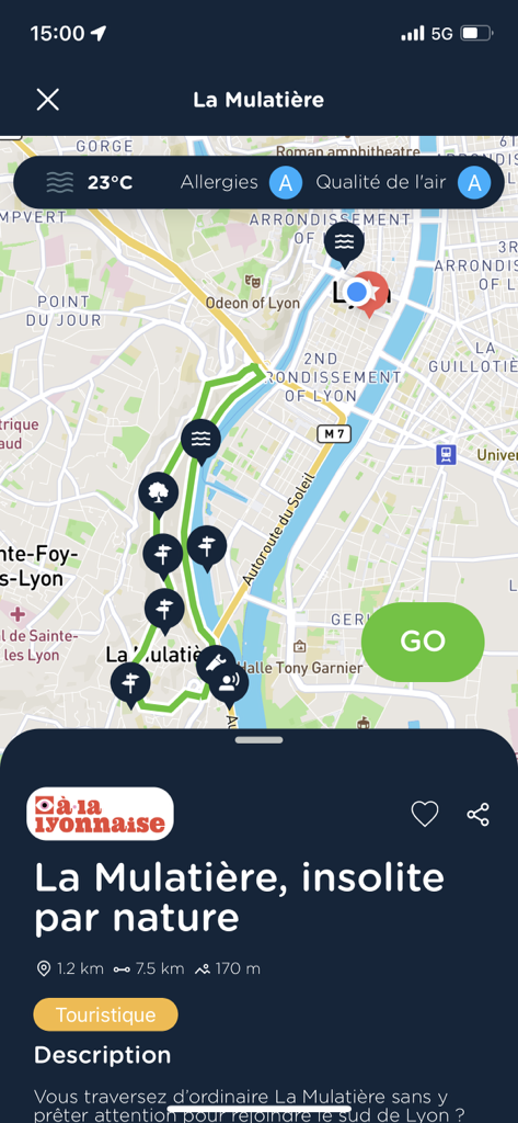 Ecouteurs vissés, il est temps de se rendre à La Mulatière. Une voix féminine se lance et la balade commence. Pour rendre le parcours plus utile et écoresponsable, votre guide n’hésitera pas à vous rappeler de ramasser les déchets présents autour de vous. En passant par La Bonne Maison, jusqu’au Quai Jean-Jacques Rousseau sans oublier l’Aquarium de Lyon, l’application reste fidèle au parcours imaginé par notre rédactrice Isabelle pour A la lyonnaise et relate l’historique de notre beau patrimoine lyonnais. Une fois votre itinéraire atteint, l’application vous indiquera la durée que vous avez mis pour effectuer le trajet ainsi que le nombre de kilomètres parcourus et calories perdus. Une application idéale pour ceux qui souhaitent s’instruire tout en se baladant.