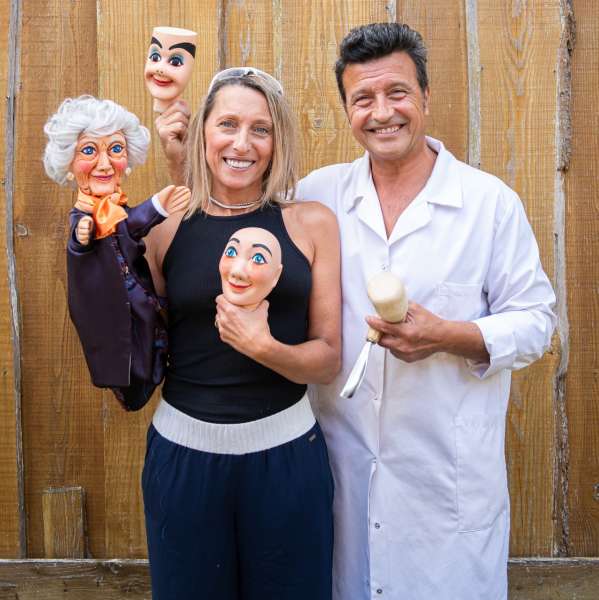 « Quel est votre métier ? » A la question, Barbara et Claudio hésitent et suggèrent « facteurs de marionnettes » considérant que le marionnettiste est l’artiste qui joue à la scène. Eux, sont les fabricants, les artisans derrière le pantin. Autodidactes initiés par le couple Pavaly, grandes figures du théâtre de marionnettes, Barbara et Claudio se sont lancés dans l’aventure il y a une quinzaine d’années. Barbara succombe alors au répertoire lyonnais, découvrant les textes de Jean-Baptiste Onofrio auteur du Théâtre lyonnais de Guignol. Claudio, lui, tombe sous le charme de cet art vivant à l’occasion du Festival Mondial des théâtres de marionnettes de Charleville-Mézières. Depuis, ils se consacrent, ensemble et entièrement à la création de marionnettes à gaine. Et les rôles sont bien distribués ! Claudio sculpte le bois de tilleul, Barbara peint et crée les costumes. Dans leur atelier secret du Beaujolais, les journées s’enchaînent au rythme des commandes en provenance des quatre coins du monde. Marionnettistes professionnels, collectionneurs et musées, dont le Musée des arts de la marionnette de Lyon, sont leurs principaux clients.