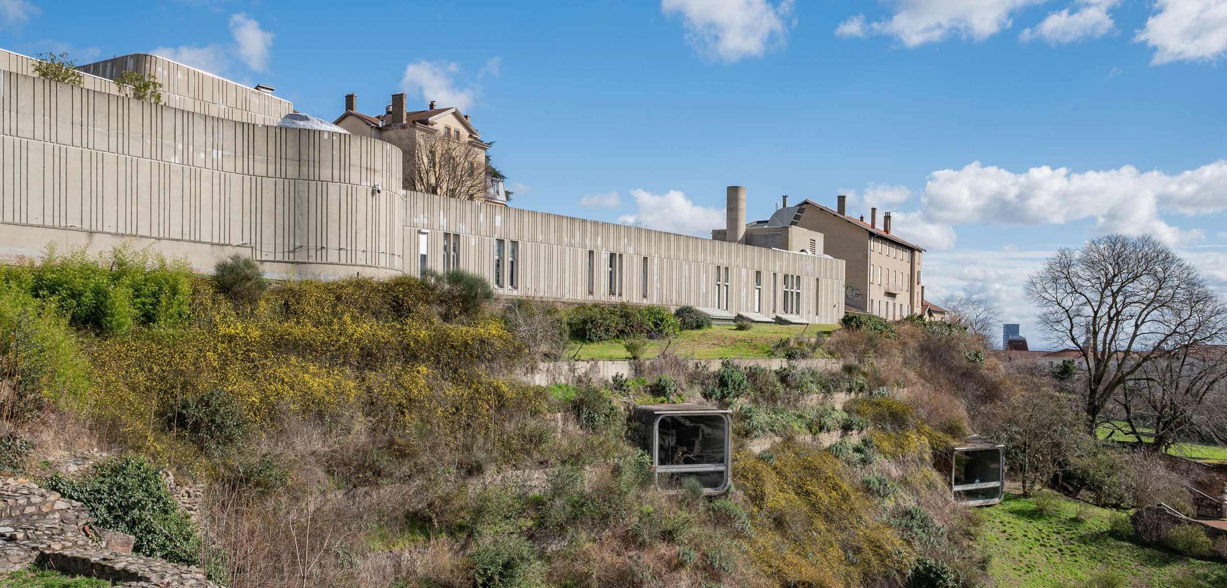 Chargé de la création de l’édifice, l’architecte Bernard Zehrfuss imagine, en 1966, un bâtiment audacieux et discret, récompensé depuis du label Architecture contemporaine remarquable. Intégré à la colline et conçu comme une « cathédrale souterraine » de béton brut, le bâtiment est inauguré le 15 novembre 1975. À l’intérieur, la pente douce et la rampe hélicoïdale guident le visiteur dans une déambulation fluide, ponctuée de puits de lumière et de vues sur les théâtres. Invisible ou presque de l’extérieur, le musée totalise 4 000 m² de surface. Il explore tous les aspects de la vie publique et privée de l’ancienne capitale de l’Empire : urbanisme, administration municipale, armée et monnaie, pratiques religieuses, jeux du cirque, commerce…