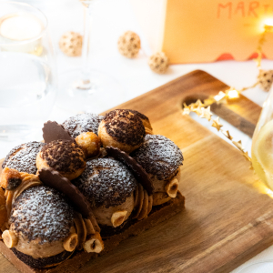 Depuis 2018, l’ascension de la famille Mariller est fulgurante. D’abord orientée vers le mono-produit avec son produit phare : une tarte pistache, framboise et vanille (aussi disponible en bûche !), Mariller les Saveurs repousse chaque année les limites de la créativité dès qu'il s'agit de bûche de Noël. La preuve déjà en 2023 avec la une bûche signature Bobosse. Si elle est de retour cette année, elle s'accompagne de 4 autres créations dont une qui retient notre attention ici : la bûche Paris-Brest. Une revisite de ce classique de la pâtisserie française au combo gagnant amande-noisette et choux.