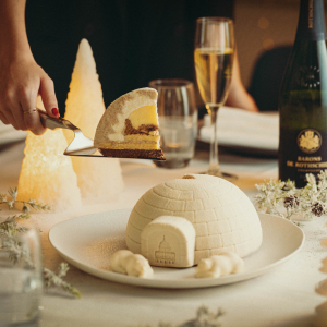 L’hiver dernier, le chef pâtissier Vincent Thomassin présentant une bûche Chalet chocolaté et gourmand. Cette saison, le chef étoilé présente un délice enneigé : une bûche igloo. Sur une base croustillante de noisettes et de chocolat, avec un biscuit moelleux à la noisette et un praliné, retrouvez une touche de fraîcheur grâce à un crémeux au yuzu et une crème montée au poivre de Sichuan aux arômes subtils et floraux. Pour terminer son look neigeux, mousse légère à la noisette, saupoudrée de fin chocolat blanc.