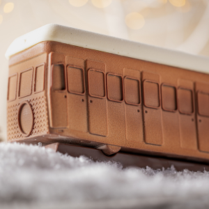 Autre création originale 2025 : le funi'polaire. Une bûche de Noël à l'esthétique d'un funiculaire, saveur épices de Noël, mousse Chai Latte, croustillant épices, biscuit moelleux, caramel épices, compotée de clémentines.