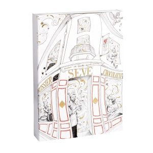Pour encore plus de magie, la maison Sève a pensé cette année un calendrier de l’avent sucré illustré par Rosemary Iman Taleb-Rivière. Avec un format en deux-volets, il retrace le savoir-faire de la maison à traves un univers poétique et dévoile de case en case au fil des découvertes matinales : papillotes (chocolats pralinés), des pralines rouges confectionnées à l’ancienne dans une précieuse turbine centenaire en cuivre, des orangettes, des mendiants au chocolat noir, des pâtes de fruits (ananas, abricot) des guimauves, la spécialité de la maison Sève la Pierre des Monts d’Or, les véritables tartes à la praline, une barre de chocolat, des florentins et d’autres surprises…