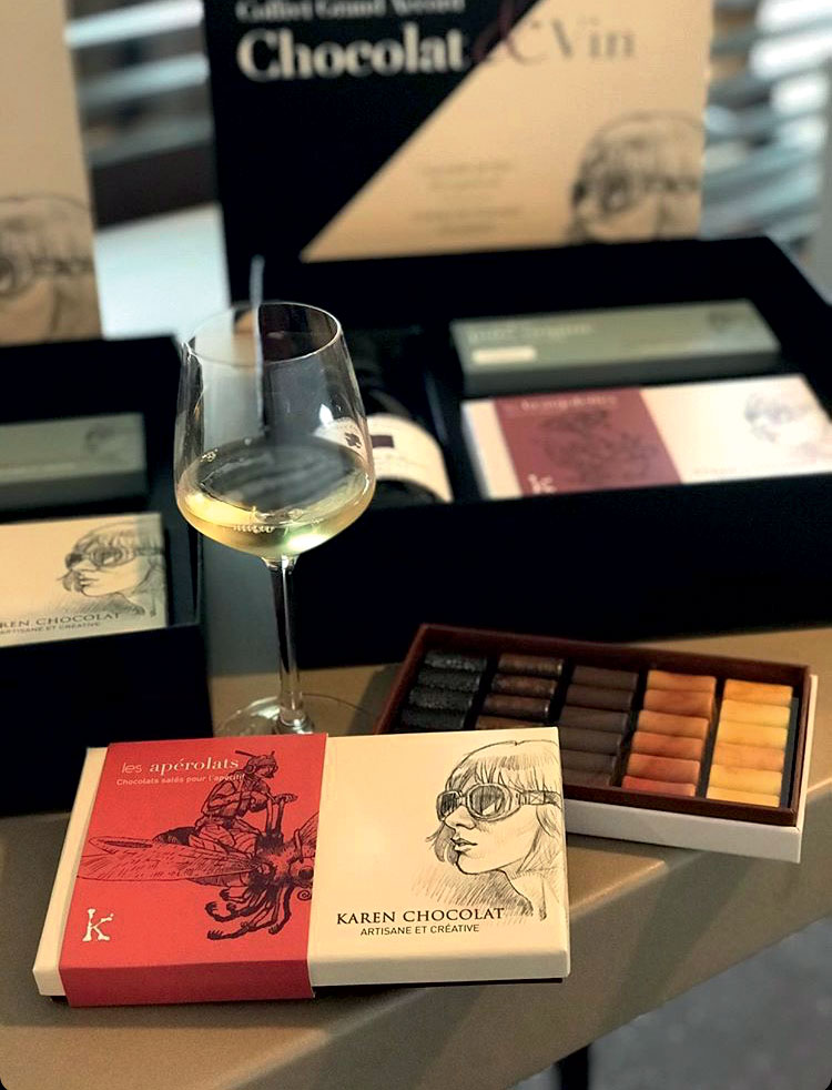 À Lyon, la chocolatière Karen Bonnet propose même « une alternative à la consommation du chocolat en fin de repas » : les « apérolats ». Elle marie ainsi safran et amandes au chocolat blanc, la truffe au chocolat noir... et invite à déguster le tout comme des mises en bouche, avec un verre de blanc sec. Poussant la créativité encore plus loin, elle associe un chocolat noir pure origine de Madagascar avec un vin de Brouilly, une pointe de mûre et de men- the dans une friandise de son invention : la Beaujolette. Et elle n’est pas la seule à trinquer au chocolat. Chez Tom & Co, brasseur du bas des Pentes de la Croix- Rousse, c’est la bière que l’on vient sublimer avec les notes corsées de cacao. Lors d’ateliers dans la brasserie, Tom et Coline jouent en effet avec les intensités et textures pour mêler chocolat intense et bière douce, amertume et légèreté... Dernière nouveauté: le trio d’Ephemera, à la Part-Dieu vient de lancer Chokä, un menu 100 % chocolat !