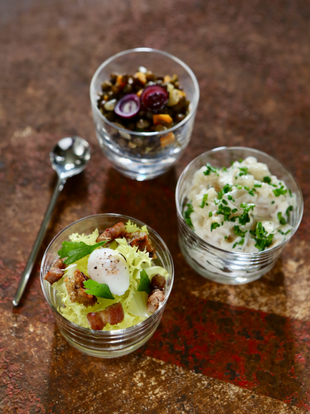 Ces salades - ainsi que celle de museau en vinaigrette ou de pommes de terre avec des cubes de cervelas - constituent la famille des fameux saladiers lyonnais, véritables institutions des bouchons lyonnais. Elles sont présentées dans de grands saladiers dans lesquels se servent les clients du restaurant. Je les ai adaptées en verrines pour les servir à l’apéritif !