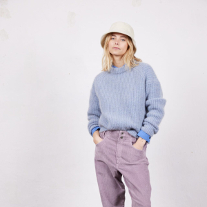 Derrière la marque de prêt-à-porter féminine lyonnaise Tinsels, deux associés, Rémi et Julien, dont la rencontre remonte aux bancs de l’École supérieure des arts et techniques de la mode (Esmod). Sur leurs portants ? Des coupes simples et des matières naturelles à l’image de ce pull oversize bleu ciel, en laine et mohair.